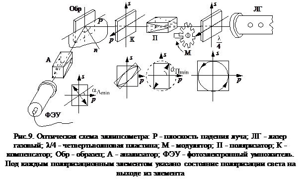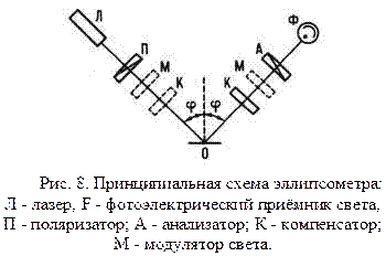 Существует большое разнообразие их конструкций. Источник света, как правило,- лазер, приёмник - фотоэлектрический. Принципиальная схема некоторых вариантов дана на рис. 8. В одном из них падающий свет поляризован линейно (линейный поляризатор П), в отражённом луче эллиптически поляризованный свет компенсатором оптическим К превращается (подбором ориентации и разности фаз компенсатора) в поляризованный линейно, азимут колебаний которого определяется линейным анализатором А по погашению сигнала в приёмнике. В другом варианте (пунктир) падающий свет поляризован эллиптически, а параметры эллипса устанавливаются так, чтобы после отражения поляризация была линейной и сигнал гасился А (нулевые схемы). В других конструкциях в обоих вариантах добиваются в отражении циркулярной поляризации, получение которой устанавливается по неизменности сигнала при вращающемся анализаторе.