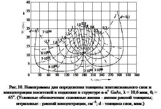 Модулятор М превращает непрерывный световой поток в переменный, что облегчает усиление сигнала с выхода фотоэлектронного умножителя ФЭУ. После модулятора луч проходит через поляризатор П, компенсатор К и после отражения от поверхности образца - через анализатор А. Независимо от характера поляризации света, падающего на поляризатор или анализатор, вышедший луч будет поляризован линейно в плоскости пропускания поляризующего элемента. Это позволяет получать поляризованное излучение с заданным азимутом поляризации (для этой цели служит поляризатор), а также определять неизвестный азимут плоскости поляризации линейно-поляризованного излучения (для этого используют анализатор). С помощью поляризатора изменяют азимут линейно-поляризованного света, с помощью компенсатора можно изменять разность фаз колебаний p - и s -составляющих. Принцип проведения эллипсометрических измерений: поворотом поляризатора добиваются такой эллиптической поляризации на выходе компенсатора, чтобы после отражения от образца свет стал линейно-поляризованным. Тогда он может быть погашен путем поворота анализатора и на фотодетекторе будет наблюдаться нулевая интенсивность. Прибор, использующий этот принцип, получил название нуль-эллипсометра. Показания угломерных устройств определяют сдвиг фаз и направление поляризации луча после отражения. Предельная чувствительность нуль-эллипсометров (то есть минимальные изменения ψ и Δ, которые могут быть зафиксированы экспериментально) определяются ценой наименьшего деления лимбов угломерных устройств анализатора и поляризатора и составляют (0,5 - 1) угловой минуты. В эллипсометрах, предназначенных для работы в ИК-области, в качестве источника излучения используется CO2-лазер типа ЛГ-23 с длиной волны излучения λ = 10,6 мкм, в качестве детектора - пироэлектрический приемник, анализатором и поляризатором служат металлические решетки или реплики на полиэтилене. Точность определения ψ и Δ не хуже 0,5о. Методом эллипсометрии в видимой области проводятся измерения толщин слоя с погрешностью (3 − 5)% в диапазоне толщин от 10 до 1000 не и в 0,5% в диапазоне толщин от 1 до 10 нм. Удалось определить наличие на поверхности пленок и слоев толщиной в от 0.1 до 0.5 нм. При исследовании рельефа атомарно-чистой поверхности были обнаружены системы ступенек на поверхности Si высотой порядка одного-двух монослоев, причем структура поверхности, как выяснилось, изменялась с температурой. Наличие такого нанорельефа вызывает существенное изменение Δ и мало влияет на ψ. Наибольшая точность определения толщины диэлектрика достигается при измерениях в пределах первого эллипсометрического периода (до 300 нм). Точность определения показателя преломления n зависит от толщины пленки. Наилучшая точность в определении n составляет 1∙10–3. Измерения толщины окисла можно проводить в окнах размером (5×5) мкм2. Эллипсометрия в ИК-области позволяет посредством бесконтактных измерений определить концентрацию и подвижность носителей заряда в сильнолегированных подложках в структурах типа n - n + или р - р + и толщину слаболегированного эпитаксиального слоя с точностью не хуже 5 нм (рис.7).