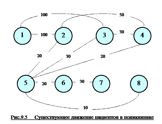 Существующее расположение восьми кабинетов поликлиники показано на рис 9.3: