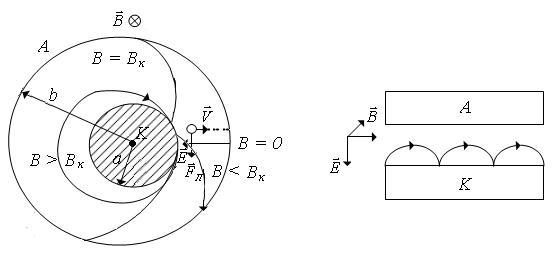 Если бы магнитного поля не было, то электроны, вылетающие из катода радиусом а, двигались бы в электрическом поле вдоль прямых линий (на рис.168 при При наличии магнитного поля траектории электронов искривляются из-за действия на электроны силы Лоренца. Если магнитное поле достаточно велико, то траектории электронов не пересекаются плоскости анода и имеют вид, изображенный на рис.169. В этом случае ни один электрон не достигает анода (рис.168 Если Если