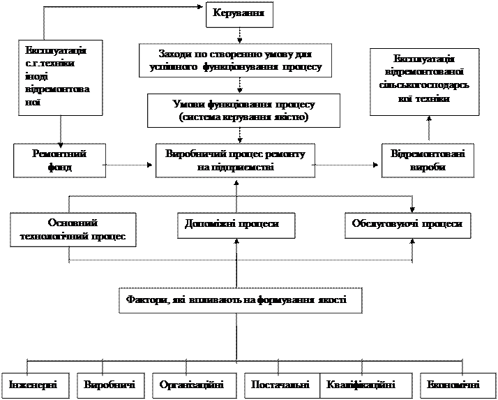 1. Основи формування оптимальної якості продукції ремонтних підприємств. Якість ремонту продукції характеризується тими познаками, які визначають її експлуатаційну придатність. До них відносяться показники: - призначення (потужність, продуктивність, швидкість, пропускна здатність тощо); - надійності (безвідказність, довговічність, збережеість тощо); - ергономічність (гігієнічні, фізіологічні, псіхологічні); - естетичні (зовнішнній вигляд); - технологічні (ремонтопридатність, трудомісткість, вартість ремонту); - транспортабельність (тривалість підготовки до транспортування, встановлення на транспортний засіб тощо); - безпеки (електрична міцність ізоляції, спрацьовання захистних пристроїв); - екологічні (ймовірність забруднення навколишнього середовища під часзберігання, транспортування і експлуатації). Показники якості встановлюються такими методами: - вимірювальними – на основі технічних засобів вимірювання; регістраційним – на основі спостережень і підрахунку кількості певних позіцій, предметів або затрат; - розрахунковим – на основі використання теоретичних і емпірічних залежностей показників якості від параметрів виробів; - експертним – на основі рішень експертів; - соціологічним - на основі аналізу бажань замовників. У процесі ремонту якіцсть виробу формується на окремих стадіях і залежить від впливу ряду факторів: - інженерних (рівень технологічних процесів ремонту, забезпечення технічною документацією, розробка технологічності конструкції): - виробничих (технічний рівень і стан обладнання, оснащення та контрольно вимірювальних засобів); - організаційних (забезпечення технологічної дисципліни, організація технічного контролю та праці, атестація якості продукції); - постачальних (сортимент і якість матеріалу, запасних частин); - кваліфікаційних (знання, досвід і кваліфікація робочих та інженгерно-технічних працівників); - економічних (рівень цін на ремонт, заохочування щодо підвищення якості ремонту, матеріальне стимулювання). Для підвищення якості ремонтуємих виробів обєднати всі впливи у єдину цільову систему, яка передбачає комплекс організаційних, технологічних, економічних і соціальних заходів. Цю систему можна уявити у вигляді графічної моделі (рис. 1), яка складається із входу (потік ремонтного фонду), виробничого процесу, виходу (відремонтовані машини, вузли, агрегати),керування і звязків. Безпосередньо у технологічному процесі формування властивостей і характеристик виробів складається із основних, допоміжних і обслуговуючих робіт.