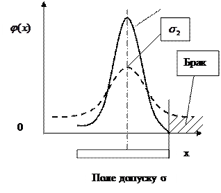 де Х0 – заданий центр настроювання процесу (номінал); δ – поле допуска параметра. Якщо коефіцієнт точності КН Гранично допустимі значення коефіцієнтів точності встановлюють залежно від умов виробництва і вимог до якості продукції. Середнє квадратичне відхилення (σ), рис. 5, характеризує величину поля фактичного розсіювання значень параметра.Його розраховують за формулою: