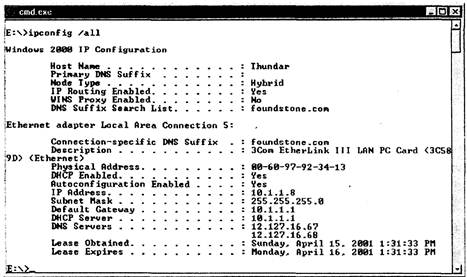 Рис. А.6. Использование ipconfig для просмотра MAC- и IP-адреса системы UP BROADCAST RUNNING MULTICAST MTU:1500 Metric: 1 RX packets:27 errors:0 dropped:0 overruns:0 frame:0 TX packets:0 errors:0 dropped:0 overruns:0 carrier:0 collisions:0 txqueuelen:100 Interrupts Base address:0x300 [root@linux]# ifconfig ethO down [root@linux]# ifconfig ethO hw ether 00:60:97:CC:8e:8c [root@linux]s ifconfig ethO up [root@llnux]# ifconfig -i ethO ethO Link encap:Ethernet HWaddr 00:60:97:CC:8E:8C inet addr:192.168.0.111 Beast:192.168.0.255 Mask:255.255.255.0 UP BROADCAST RUNNING MULTICAST MTU:1500 Metric:1 RX packets:27 errors:0 dropped:0 overruns:0 frame:0 TX packets:0 errors:0 dropped:0 overruns:0 carrier:0 collisions:0 txqueuelen:100 Intrrupt:9 Base address:0x300