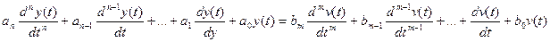 В общем случае можно рассматривать все перечисленные ранее переменные как компоненты многомерных векторных функций. С точки зрения макроподхода аналоговые САУ с сосредоточенными параметрами можно описать системой дифференциальных равнений, связывающих входные переменные В общем случае эта система уравнений является нелинейной. В простейшем случае для одномерной системы (один вход, один выход) система имеет вид: