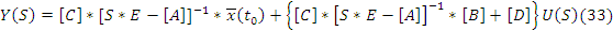 Решение непрерывного векторного уравнения состояния(Уравнения динамики) Можно реализовать на основе аналитического метода матричных экспанент). При этом полагаем что предварительно определены и известны матрица динамики А, матрица входа Б, воздействия U(t) при всех t>=t0. А также определён вектор начальных состояний(Независимые начальные условия). X(t0). В этом случае общий вид полного интеграла(Решения системы) будет иметь следующий: 27 в тетради Где, 28. Таким образом вектор x(t) есть Пояснение. В выражениях 28,29,30 матрица e в степени матрица [A]*t есть матричная экспонента или матрица перехода, которую можно представить в виде бесконечного ряда из матриц(выражение матричной экспаненты). В области изображений по Лапласу. Решение 30 будет иметь вид: В 33 мы избавились от интегралов и залезли в операции с матрицами. E – единичная матрица. Из уравнения 33 определяется передаточная функция. 34,35 Решение непрерывного уравнения состояния во временной области t (30) приводит к необходимости определения матричной экспаненты и интеграла свёртки матричной экспоненты с входным воздействием. Реализация решения 30 может осуществляться по разному например: Если u(тау) представляет собой относительно не сложную функцию то интеграл свёртки, то интеграл свёртки можно определить аналитически. В этом случае саму матричную экспаненту целесообразно определять аналитически. Например по теореме Кели-Гамильтона смотри любой справочник по высшей математики, или по теореме Сильвестра. Решение в этом случае будет аналитческим. В виде аналитического выражения. Если интеграл свёртки определяется весьма сложно, то его целесообразно определять приближёнными методами по любому подходящему алгоритму. В этом случае матричную экспаненту целесообразно опеделять численно по выражению (31), редуцируя этот ряд. Кроме этого возможна комбинация численного определения интеграла свёртки и аналитического определения матричной экспаненты или же использование разностных формул для решения (30).