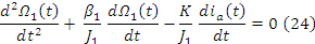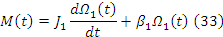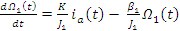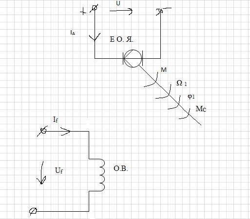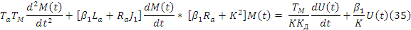 Пример описания управления. В качестве примера рассмотрим математическое описание исполнительного двигателя станочного электропривода. Для простоты будем рассматривать как базовый вариант исполнительный двигатель постоянного тока с неизменным возбуждением. (Неизменным магнитным потоком полюса индуктора) Так как математическая модель этого двигателя является относительно простой, её характеристики близки к линейным(Не все) и целесообразно её взять за базовую. Замечание: Кроме ДПТ широко используется в современным станочных системах различные вентельные двигатели переменного тока, а также асинхронные двигатели, однако их математические модели такого же уровня описания на много сложнее математической модели упомянутого ДПТ. ДПТ с неизменным возбуждением(Неизменным магнитным потоком полюса индуктора). Исходная информация об объекте. ДПТ с независимым возбуждением это может быть по схеме включения как с независимым возбуждением так с параллельным или последовательным возбуждением. Это по схеме включения. В качестве примера рассмотрим ДПТ с независимым возбуждением. В этом случае обмотка якоря имеет свой источник, а обмотка возбуждения(индуктора) имеет свой источник независимый от источника якоря. Кроме того вместо обмотки возбуждения могут быть постоянные магниты. Оба этих варианта предполагают, якорный способ управления двигателем, т.е. управлением осуществляется по цепи обмотки якоря, например за счёт изменения напряжения U на обмотке якоря в этом случае поток полюса фи(t) индуктора остаётся практически неизменным. (Это допущение о пренебрежении реакции искажения результирующего поля за счёт реакции якоря.) Фи(t) равен const. Схема включения (1). Схема включения (2). Выписываем (3). U(в) – источник постоянного напряжения на обмотке якоря. Uf(в) – постоянное напряжение на обмотке возбуждение. Реакции на решающие возбуждения: Ia(A);If(A) E(в) – ЭДС в обмотке якоря. На валу: M(Нм) – электромагнитный момент развиваемый двигателем. Mс(Нм) – вопрос сопротивления на валу двигателя. Ω1 (Рад/сек) – угловая частота вращения вала двигателя. φ1 (Рад) – угловое перемещение вала двигателя. Для составления уравнений состояния ДПТ воспользуемся известной нам информацией основанной на физических законах. Уравнение движения(Ссылаясь на картинку). (4) Уравнение равновесия моментов. Момент сопротивления. В самом простом варианте моментом сопротивления является момент вязкого трения ротора. Пусть Мс = Мс1 = бетта1 * Ω1(Н*м) Где (5) приведённые коэфицент трения. (6). Номинальная частота вращения. Где nном(об/мин) – паспортные данные. Уравнение статического равновесия цепи якоря.(Закон киргофа) (7). В статическом режиме, где E – определяется по (8) Ra активное сопротивление обмотки якоря, либо паспортные данные либо измеряется физические приборы. CE конструктивная константа двигателя. (9). p – число пар полюса, паспортные данные. N число Число параллельных ветвей обмотки якоря паспортные данные. Фи(Вб) – магнитные поток полюса индуктора. (10) Электромагнитные момент развиваемый якорем двигателя (Ротером) (11). Учитывая предидущие допущения о неизменности потока φ можем константы E и M принять за константы и обозначить как (12). В динамике уравнения (7) принимает вид (13) Уравнение (12) принимает вид (14). La индуктивность обмотки якоря в (Гн) паспортные данные. KE. Рассчёт КМ и К