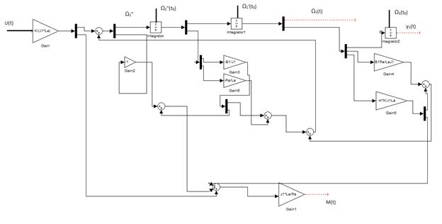 При составлении структурной схемы модели следует исключить ввиду рядов причин использование дифференцирующих блоков. Предпочтительно построение схемы на базе пропорциональных блоков интеграторов, сумматоров. Перепишем уравнение 9,10,11, проинтегрировав их левые и правые части. Получаем (1). Система18-20 не содержит производных. Принцип построения схемы следующий: (рис. 2) Блок схема в модели ДПТ в программе состояний. При составлении уравнения в координатах вход – выход также как и при описании объектов в пространстве состояний в качестве основы необходимо использовать информацию об объекте. Эта информация основана на физических законах. Как правило такая информация описывает колличественно описывает какую либо из сторон реальных процессов в объекте. В нашем случае для ДПТ можно использовать в качестве начальной информации уравнения от 1 до 10. Однако необходимо выбрать из этих уравнений те, которые уже содержат в удобной форме принятые нами переменные входа и переменные выхода. Наиболее удобными в данном случае являются уравнения 9 и 10. В качестве желаемой, окончательной форме представления модели примим следующую форму: (3). Пусть (4). В уравнении 9 присутствует омега. Перепишим уравнение 9 в следующем виде: (5). Продифференцировав 23 получаем. (6). Подставим в 24 из уравнения 10 выражение производной dia(t) / dt. (7). 26 – это окончательный результат. Перепишем 26 введя общепринятые в ТАУ и теории электрических машин постоянные, которые зависят только от параметров двигателя. Ta электромагнитная постоянная времени (8) секунды. TM электромеханическая постоянная времени двигателя. (9). Kд – постоянная двигателя.(10) Все эти постоянные можно определить по соответствующим паспортным данным двигателя или по данным каталога. В результате относительно несложных преобразований и подстановок уравнение 26 примет вид.(11) Уравнение 28 можно переписать введя ещё одни обозначения.(12) В этом случае в операторной форме она будет иметь ввид: (13) В уравнениях 29, 30 зетта коэффициент дельпфирования. В области изображения по лаплассу перепишем: (14) Соответственной имеем звено 2-го порядка которое может быть в зависимости от значения коэфициента зетта либо колебательным либо апериодическим. Коэффициент зетта в свою очередь определяется параметрами двигателя Тм и Та Эта модель имеет соответствующие частотные и временные характеристики. АЧХ, ФЧХ, переходную и импульсную. Если в качестве выходной переменой рассматривать электромагнитный момент, а в качестве входной U(t). Т.е. если (15) Для получения модели объекта в форме 29 можно получить уравнения 9 переписав его соответствующим образом с учётом выражений 6 и 8. Получается (16). После несложных преобразований и подстановок с учётом уравнения 8 получаем из 33 (16) Уравнение 34 с учётом принятых ранее обозначения будет иметь вид: (17) Вывод коэффициенты a0 a1 a2 - совпадают с коэффициентами из уравнения 27,а отличаются только b1 b0 Учитывая принятые ранее константы T и дзетта для случая бетта 1 равное 0 (принебрежения вязким трением получаем уравнения упрощённой (18) В области изображения по лапласу (19) Структурная схема модели ДПТ в координатах вход-выход во временной области. Базовым является уравнение (27) и (35). Принцип построения один и тот же, что был рассмотрен нами ранее для системы уравнения состояния. Рисунок(20) Независимые начальны у