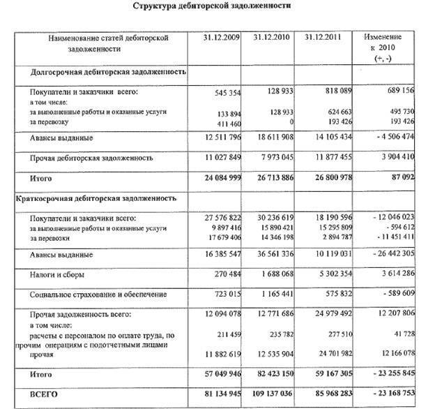 Дебиторская задолженность в компании разделяется на долгосрочную и краткосрочную. Долгосрочная дебиторская задолженность на 31.12.11 составляет 26,8 млрд. руб., и имеет незначительное увеличение к началу году на 0,9 млрд. руб. Долгосрочные авансы, выданные на конец 2011 года, составили 14,1 млрд. руб. В составе авансов выданных: