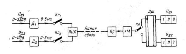 Предположим, что необходимо измерить и передать два переменных напряжения, изменяющихся в пределах U x1 = 0 – 220 В и U x2 = 0 ÷ 110 В. Оба эти напряжения поступают на датчик Д 1 и Д 2, имеющие одинаковый выходной ток 0 -5 мА. Это означает, что при поступлении напряжений на датчик Д 1 220 В, а на датчик Д 2 – 110 В на выходах обоих датчиков будет один и тот же ток 5 мА. Далее с помощью ключей К1 и К2 токи с датчиков поочередно поступают на аналого – цифровой преобразователь АЦП, где они преобразуются в двоичный код, который может передать 27 = 128 дискретных значений.