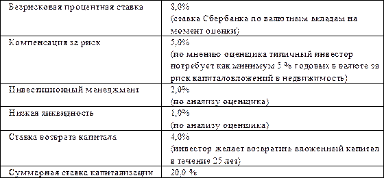 Ставка капитализации, определенная таким способом, называется общей ставкой капитализации. Для ее определения необходимо иметь рыночные данные по продажам аналогичных объектов недвижимости. Понятно, что получить такие данные в условиях становления рынка недвижимости представляется довольно проблематичным, но следует помнить, что этот метод является наиболее точным и часто применяется в условиях развитых рыночных отношений. Суть метода кумулятивного построения, или метода суммирования состоит в том, что ставка капитализации разбивается на составные части, состоящие из безрисковой ставки в качестве базисной, ставок компенсации за риск, низкую ликвидность и инвестиционный менеджмент (управление инвестициями). Если известны все четыре составляющих ставки, то путем суммирования можно получить ставку капитализации. В качестве базисной в этом методе используется так называемая безрисковая ставка. Например, в США в качестве такой ставки используется ставка по долгосрочным правительственным обязательствам. В условиях же нестабильной российской экономической ситуации безрисковой ставки практически не бывает. Поэтому следует вести речь о наименее рискованных ставках. В качестве таковой может быть использована ставка рефинансирования Центрального Банка или ставка по вкладам Сбербанка, как наиболее надежного на сегодня банка России. Вложения капитала в недвижимость имеют более высокий риск, чем все другие инвестиции, поэтому ставка капитализации должна учитывать это путем увеличения с тем, чтобы инвестор с капиталом взял на себя этот риск. Под ликвидностью понимается быстрота, с которой актив может быть превращен в наличные денежные средства. Недвижимость является низколиквидным товаром. Этот фактор учитывается ставкой компенсации за низкую ликвидность. Так как вложение капитала в недвижимость является рискованным, то и управление этими инвестициями (выбор варианта финансирования, отслеживание рынка, принятие решения о продаже или удержании объекта, работа с налоговыми органами и т. д.) требует определенных усилий, которые должны компенсироваться путем включения в ставку инвестиционного менеджмента. Кроме получения прибыли в виде процентов по вложению капитала, разумный инвестор учтет также и время возмещения (возврата) вложенного капитала, то есть к полученной ставке необходимо будет добавить ставку возмещения капитала. Пример. Жилой многоэтажный дом оценен в $750000. Определить ставку капитализации (табл. 4). Таблица 4