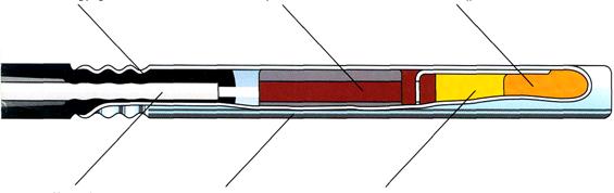 Гильза детонатора сделана из алюминия и имеет длину от 45 до 95 мм, в зависимости от времени замедления. Детонаторы несут предупреждение ДЕТОНАТОР ОПАСНОГО ВЗРЫВЧАТОГО ВЕЩЕСТВА. Элемент задержки состоит из алюминиевой трубки заполненной пиротехническим составом. Используя, элементы с различными скоростями горения и изменяя длины трубок, можно получить различные степени замедления. Элемент инициирования состоит из стальной трубки, заполненной взрывчатым веществом PETN, который является вторичным взрывчатым веществом. Основная первичная нагрузка состоит из взрывчатого вещества ГЕКСОГЕНА снаряженного в алюминиевой гильзе. Детонатор в нонель – системе состоит из следующих частей: · металлическая (алюминиевая) гильза; · нонель – трубка; · элемент инициирования (PETN)-вторичное ВВ; · элемент задержки (степень замедления) пиротехнический состав; · основная нагрузка (гексоген) -первичное ВВ; · резиновый штепсель – уплотнитель; · бумажная лента (пленка) на нонель – трубке на которой указывается степень замедления и длина гильзы.