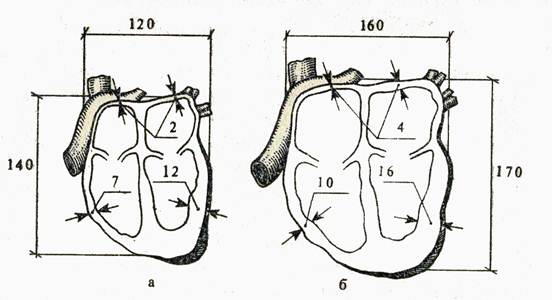 Рис. 4. Сердце нетренированного (а) и тренированного (б) человека