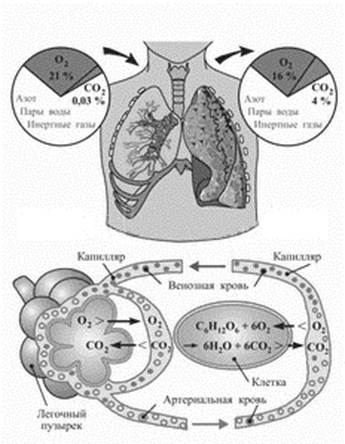 Между организмом человека и окружающей средой происходит постоянный газообмен. Кислород из атмосферного воздуха переходит в кровь, а углекислый газ из крови во внешнюю среду. Газообмен организма с внешней средой происходит с помощью органов дыхания. Дыхательный аппарат человека состоит из воздухоносных путей (полость носа, трахея, бронхи), грудной клетки и дыхательной мускулатуры (рис.5). Местом, где происходит обмен газами между воздушной средой и кровью, являются альвеолы легких, представляющие собой мельчайшие пузырьки с общей поверхностью примерно в 10 раз большей поверхности человеческого тела. Альвеолы густо пронизаны капиллярами, через стенки которых легко проходят кислород и углекислый газ.