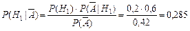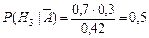 События полной группы H1, H2, …Hn обычно называют гипотезами. Их вероятности были известны до проведения опыта. Пример. В районе имеется три кинотеатра. Вероятность того, что Света пойдет в первый кинотеатр, равна 0,5; во второй – 0,3; в третий – 0,2. Вероятность встретить Ирину в одном из этих кинотеатров равна соответственно 0,7; 0,5 и 0,3. Света пошла в кино. Найти вероятность того, что она встретит Ирину. Решение: Обозначим А – событие, состоящее в том, что Света встретит Ирину в кинотеатре; Н1 – встреча состоялась в первом кинотеатре, Н2 -во втором, Н3 – в третьем. Из условия задачи известны: Р(Н1)=0,5; Р(Н2)=0,3; Р(Н3)=0,2, а также Р(А) = 0,5×0,7 + 0,3×0,5 + 0,2×0,3 = 0,56. Пример. Данные из предыдущего примера. Известно, что Света встретила Ирину в одном из кинотеатров. Найти вероятность того, что встреча состоялась в первом кинотеатре. Решение: Используя полученные выше результаты, по формуле Байеса находим: Пример. Три экзаменатора принимают экзамен по некоторому предмету у группы в 30 человек, причем первый опрашивает 6 студентов, второй — 3 студентов, а третий — 21 студента (выбор студентов производится случайным образом из списка). Отношение трех экзаменаторов к слабо подготовившимся различное: шансы таких студентов сдать экзамен у первого преподавателя равны 40%, у второго — только 10%, у третьего — 70%. Найти вероятность того, что слабо подготовившийся студент сдаст экзамен. Решение. Обозначим через