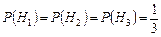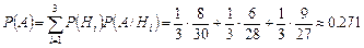 Отсюда следует, что, вероятнее всего, слабо подготовившийся студент сдавал экзамен третьему экзаменатору. Пример. Была проведена одна и та же контрольная работа в трех группах. В первой группе из 30 студентов 8 выполнили работу на «отлично», во второй, где 28 студентов, – 6 «отличных» работ, в третьей, где 27 студентов, – 9 работ выполнены на «отлично». Найти вероятность того, что первая выбранная наудачу работа из работ, принадлежащих группе, которая также выбрана наудачу, окажется «отличной». Решение: Имеем три гипотезы: H1 – выбрана работа из 1-й группы, H2 – выбрана работа из 1-й группы, H3 – выбрана работа из 1-й группы. Очевидно, что