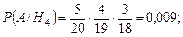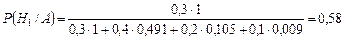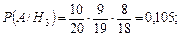 Пример. В группе из 10 студентов, пришедших на экзамен, 3 студента подготовлены отлично, 4 - хорошо, 2 - удовлетворительно и 1 - плохо. В экзаменационных билетах имеется 20 вопросов. Отлично подготовленный студент может ответить на все 20 вопросов, хорошо подготовленный - на 16, удовлетворительно подготовленный - на 10, плохо подготовленный - на 5. Вызванный наугад студент ответил на все три заданных преподавателем вопроса. Найти вероятность того, что этот студент: а) подготовлен отлично; б) подготовлен плохо. Решение. Пусть событие А={студент ответил все три вопроса}. Введем систему гипотез: H1={студент подготовлен отлично}; H2 ={студент подготовлен хорошо}; H3={студент подготовлен удовлетворительно}; H4 ={студент подготовлен плохо}. Находим вероятности гипотез: P(H1) = 0,3; P(H2) = 0,4; P(H3) = 0,2; P(H4) = 0,1. Находим условные вероятности события А.