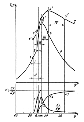 Швидкість згоряння Горіння - складний фізико-хімічний процес, що дотепер цілком не вивчений. Процес згоряння завжди протікає в газовій фазі. На величину швидкості горіння впливають каталізатори (водяні пари, платина й ін.). У карбюраторних двигунах, з метою придушення детонації, застосовують негативні каталізатори - карбоніл заліза, тетраетилсвинець і ін. При згорянні однорідних вуглеводених палив максимальна швидкість полум'я одержується, коли пальна суміш трохи збагачена. У випадку, коли швидкість знижується до ~0,1 м/с полум'я гасне. Збагачення суміші, при якому полум'я гасне, називається верхньою концентраційною межею amin, а межа можливого збідніння нижнею концентраційною межею amax поширення полум'я. За цими межами горіння однорідних сумішей неможливо. Для бензинових двигунів: amin=0,4-0,6; amax=1,4-1,6. У ДВЗ має місце турбулентне горіння, що представляє собою процес турбулентного змішання продуктів згоряння і свіжої суміші і потім згоряння останньої внаслідок підвищення її температури. Швидкість згоряння визначається в основному турбулентними пульсаціями в камері згоряння інтенсивністю перемішування продуктів згоряння зі свіжою сумішшю. Самозапалювання - прогресуюче прискорення реакцій. Воно настає, коли швидкість тепловиділення за рахунок хімічних реакцій перевищує швидкість відводу тепла в навколишнє середовище. У дизелі самозапалювання відбувається при упорскуванні палива в стиснене повітря; у карбюраторному двигуні - заряду при детонації. Час від моменту вприскування палива в циліндр до появи видимого полум'я називають періодом затримки запалення. Аналіз процесів згоряння в дизелі У дизелі паливо впорскується в стиснене повітря, що має тиск 3-4 МПа і температуру 800-1000 ºС. Для аналізу процесу згоряння використовують індикаторну діаграму в координатах p-j.