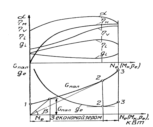 14.3 Навантажувальні характеристики Двигуни, призначені для привода генераторів, компресорів, насосів і т.п. повинні працювати так, щоб частота обертання вала привода при змінах навантаження змінювалася можливо менше. Тому роботу таких двигунів оцінюють по характеристиках, отриманих при постійній частоті обертання. Ці характеристики називають навантажувальними. Навантажувальна характеристика карбюраторного двигуна показана на малюнку 14.3.
