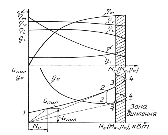 При збільшенні зовнішнього навантаження і відкритті дросельної заслінки внаслідок зменшення гідравлічного опору карбюратора знижується розрідження у впускному трубопроводі, витрата пальної суміші, а, отже, і годинна витрата палива збільшуються, що й обумовлює підвищення крутного моменту, і потужності. В області малих і середніх навантажень карбюратор повинен забезпечувати готування пальної суміші так називаного економічного складу, що змінюється від aэк = 0,7 - 0,85 на холостому ходу до aэк = 1,1 - 1,2 поблизу повного навантаження. Найменша ефективна питома витрата палива досягається при максимальному значенні добутку hihм на режимі, що передує включенню економайзера. У діапазоні навантажень 80 - 100% від повного, незважаючи на триваючий ріст hм, ефективна витрата палива збільшується через зниження hi внаслідок переходу до збагаченого склада суміші. Навантажувальні характеристики визначають при різних, постійних для кожної характеристики частотах обертання послідовним збільшенням подачі палива в межах зміни навантаження від нуля до відповідної повної подачі чи подачі, яка більше повної. Навантажувальна характеристика дизеля представлена на малюнку 14.4.