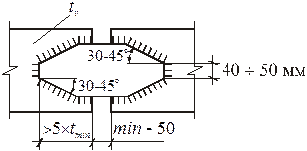 Рис. 4.11 1) Суммарная площадь сечения накладок не должна быть меньше сечения основных элементов; 2) Размер напусков не должен быть меньшим чем 5tmin (где tmin – толщина наиболее тонкого элемента) 3) Форма накладок должна обеспечивать плавный переход усилий с одного элемента на другой. Особенно это касается конструкций, на которые действуют динамические нагрузки. 4) При близком размещении сварних швов расстояния между ними не должно быть меньше чем 50 мм. Это уменьшает остаточные напряжения от термического воздействия каждого шва.