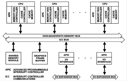 APIC – Advanced Programmable Interrupt Controller. В многопроцессорной системе реализуется на основе ______________________________________. Включает два базовых функциональных модуля: – локальный (______________); – системный (_/________). Модули APIC: – функционируют ______________________; – взаимодействуют _____________________: – специальной последовательной (Interrupt Controller Communications bus, ICC); – cистемной* (Front-Side bus).