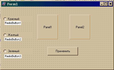 Второй вариант может быть, когда создается один обработчик для всех трех кнопок: procedure TForm1.RadioButton1Click(Sender: TObject); begin if (Sender as TRadiobutton) = RadioButton1 then Panel1.Color:= clRed; if (Sender as TRadiobutton) = RadioButton2 then Panel1.Color:= clYellow; if (Sender as TRadiobutton) = RadioButton3 then Panel1.Color:= clGreen; end; В этом случае в конструкторе объектов следует каждой кнопке назначить этот обработчик. Замечание. Первоначальное состояние кнопок можно установить с помощью конструктора объектов.