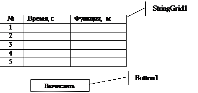 В обработчике FormCreate записываем следующее: Procedure TForm1.FormCreate(); var i: integer; begin A:= 0.01; tk:= 10; w:= 2; h:= 0.1; N:= round(tk/h)+2; StringGrid1.RowCount:= N; StringGrid1.ColCount:= 3; StringGrid1.Cells[0, 0]:= ’N’; StringGrid1.Cells[1, 0]:= ’Время, с’; StringGrid1.Cells[2, 0]:= ’Функция, y’; StringGrid1.Options:= [goVertLine, goHorLine];