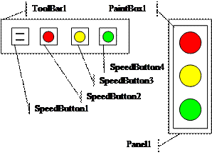 Procedure TForm1.SpeedButton2Click(); begin with PaintBox1.Canvas do begin Brush.Color:= ColorBrush; Ellipse (5, 55, 50, 100); Ellipse (5, 105, 50, 150); Brush.Color:= clRed; Ellipse (5, 5, 50, 50); end; end;