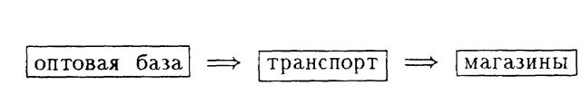 Различные подходы к организации материального потока проиллюстрируем на примере снабжения магазинов бакалейными товарами со складов оптовой базы. Участники этого процесса: оптовая база, транспортное предприятие и сеть обслуживаемых продовольственных магазинов, изображены на рис. 24.