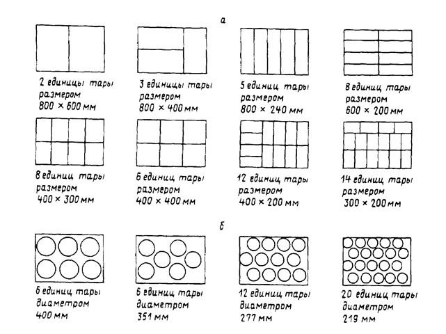 Рис. 68. Примеры размещения транспортной тары различного размера на поддоне 1200х800 мм (в плане): а) тары прямоугольного сечения; б) тары круглого сечения