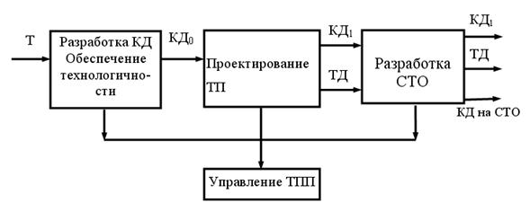 Научно-технический прогресс в современных условиях характеризуется частой сменой объектов производства, которые являются сложными комплексами, насчитывающими десятки тысяч элементов и деталей. Освоение новых образцов изделий, повышение их технических характеристик, обеспечение высокого качества на уровне лучших мировых образцов и экономической эффективности, уменьшение сроков освоения новых изделий непосредственно связаны с технологической подготовкой производства. Технологическая подготовка производства (ТПП) — это совокупность организационно–технических мероприятий и инженерно-технических работ, обеспечивающих технологическую готовность предприятия к выпуску изделий заданного уровня качества при установленных сроках, объемах выпуска и затратах. Для постановки на производство новых изделий на каждую тысячу деталей требуется свыше 15 тыс. единиц различной технической документации и до 5 тыс. различных видов оснастки и инструмента. Выполняют эту работу проектно-конструкторские и технологические службы предприятия, цехи машиностроительного производства и аналогичные службы предприятий-смежников. ТПП решает следующие основные задачи (рис. 1.4): обеспечение технологичности конструкции изделий; разработка технологического процесса (маршрутно-операционного, операционного); проектирование СТО; управление процессом ТПП. Значительный вклад в решение проблемы сокращения сроков подготовки производства внесла Единая система технологической подготовки производства (ЕСТПП), которая обобщила и регламентировала (в стандартах) с научных и методических позиций передовые инженерные решения в области ТПП. ЕСТПП — установленная государственными стандартами система организации и управления процессом ТПП, предусматривающая широкое применение прогрессивных унифицированных ТП, стандартной технологической оснастки и оборудования, средств механизации и автоматизации производственных процессов, инженерно-технических и управленческих работ. Система предусматривает решение следующих основных задач: · обеспечение технологичности конструкции изделия; · разработка технологических процессов; · конструирование средств технологического оснащения; · отладка и внедрение ТП и средств технологического оснащения; · организация линий, участков и цехов основного производства; · организация ТПП на базе типовой схемы и типовых положений, а также ее совершенствование; · управление процессом ТПП во взаимосвязи с другими функциональными подсистемами автоматизированной системы управления производством (АСУП). Повышение качества принимаемых технологических решений может быть достигнуто лишь за счет технико-экономического обоснования путем рассмотрения большого числа вариантов и выбора наилучшего. Это возможно в рамках автоматизации ТПП новых изделий. Автоматизированная система ТПП (АСТПП) — это человеко-машинная система ТПП, в основу которой положен комплекс экономико-математических методов и моделей, организационных форм, электронно-вычислительной и организационной техники с соответствующим оборудованием и программно-математическим обеспечением.