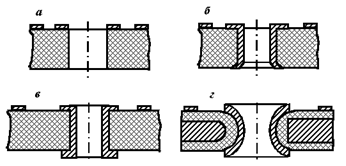 ОПП выполняются на слоистом прессованном или рельефном литом основании без металлизации (рис. 5.2, а) или с металлизацией (рис. 5.2, б) отверстий. Платы на слоистом диэлектрике просты по конструкции и экономичны в изготовлении. Их применяют в бытовой РЭА, блоках питания, устройствах техники связи. Высокую технологичность и нагревостойкость имеют рельефные литые платы, на одной стороне которых расположен печатный монтаж, а на другой — объемные элементы. Более надежны в эксплуатации платы с металлизированными отверстиями. ДПП имеют проводящий рисунок на обеих сторонах диэлектрического (рис. 5.2, в) или металлического (рис. 5.2, г) основания, а необходимые соединения выполняются с помощью металлизированных отверстий. Такие платы позволяют реализовать более сложные схемы, обладают повышенной плотностью монтажа и надежностью соединений, имеют лучший теплоотвод, однако требуют нанесения изоляционного покрытия и сложны в изготовлении. Расположение элементов печатного монтажа на металлическом основании позволяет решить проблему теплоотвода в мощной радиопередающей аппаратуре. ДПП используются в системах управления и автоматического регулирования, ЭВМ, измерительной технике.