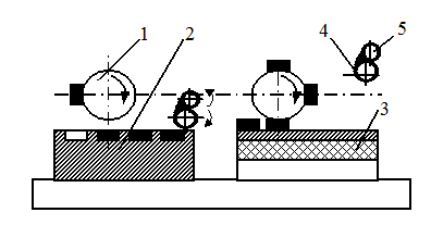 1 – офсетный валик; 2 – клише; 3 – плата; 4 – валик для нанесения краски; 5 – прижимной валик