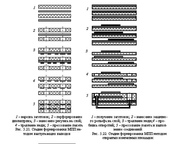 Метод выступающих выводов характеризуется тем, что при его осуществлении межслойные соединения образуются за счет выводов, выполненных из полосок медной фольги, выступающих с каждого печатного слоя и проходящих через перфорированные отверстия в диэлектрических межслойных прокладках. Выводы отгибаются на наружную сторону МПП и закрепляются пайкой в специальных колодках. Метод включает следующие операции (рис. 5.21): · изготовление заготовок из стеклоткани и медной фольги (нарезка в размер); · перфорирование стеклоткани; · склеивание заготовок перфорированного диэлектрика с медной фольгой; · получение защитного рисунка схемы отдельных слоев; · травление меди с пробельных мест; · прессование пакета МПП; · отгибка выводов на колодки и закрепление их; · облуживание поверхности выводов, механическая обработка платы по контуру; · контроль, маркировка.