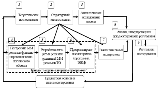 Вычислительный эксперимент в ОМД Компьютерное моделирование как новый метод научных исследований основывается на: - математических моделях, описывающих изучаемый процесс; - применении вычислительных машин, обладающих высоким быстродействием (миллионы операций в секунду) и способных вести диалог с человеком. Исходя из того, что компьютерное моделирование применяется для исследования, оптимизации и проектирования реальных технологических объектов (систем), можно выделить следующие этапы этого процесса (рис. 3.1): 1) определение объекта – установление границ, ограничений и измерителей эффективности функционирования объекта; 2) формализация объекта (построение модели) – переход от реального объекта к некоторой логической схеме (абстрагирование); 3) подготовка данных – отбор данных, необходимых для построения модели, и представление их в соответствующей форме; 4) разработка моделирующего алгоритма и программы ЭВМ; 5) оценка адекватности – повышение до приемлемого уровня степени уверенности, с которой можно судить относительно корректности выводов о реальном объекте, полученных на основании обращения к модели; 6) стратегическое планирование – планирование вычислительного эксперимента, который должен дать необходимую информацию; 7) тактическое планирование – определение способа проведения каждой серии испытаний, предусмотренных планом эксперимента; 8) экспериментирование – процесс осуществления имитации с целью получения желаемых данных и анализа чувствительности; 9) интерпретация – построение выводов по данным, полученным путем имитации; 10) реализация – практическое использование модели и результатов моделирования; 11) документирование – регистрация хода осуществления процесса и его результатов, а также документирование процесса создания и использования модели. В представленной на рис. 3.1 схеме организации процесса компьютерного моделирования (имитации) основная цепочка (реальный технологический объект (система) – математическая модель – моделирующий алгоритм – программа ЭВМ – вычислительный эксперимент) соответствует традиционной схеме, но во главу угла теперь ставится понятие триады: модель – алгоритм – программа (блоки 4, 5, 6), стратегическое и тактическое планирование вычислительного эксперимента (блок 7), интерпретация и документирование его результатов (блок 8).