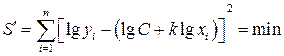 На рис. 3.4 y 1, y 2, …, y n – экспериментальные значения, f (x 1), f (x 2), …, f (x n) – расчетные значения аппроксимирующей функции. Аналогичные значения, но только в логарифмическом измерении, приведены на правой части рисунка. В основе метода наименьших квадратов лежит следующее положение: наилучшее приближение аппроксимирующей функции y = f (x) к экспериментальным данным будет в том случае, когда сумма квадратов отклонений расчетных значений f (x 1), f (x 2), …, f (x n) от экспериментальных данных y 1, y 2 … y n, является минимальной [16], т.е.
