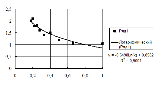 На рис. 3.5 представлены экспериментальные точки на поле будущего графика в EXCEL, а на рис. 3.6 аппроксимация логарифмической зависимостью у= 0,8582–0,6498ln(x), коэффициент корреляции 0,9. В работе [28] эта зависимость аппроксимирована формулой