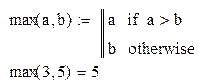 MathСad "рабочий лист" – действительно программа, потому что фиксирует последовательность вычислений. Стоит изменить некоторые входные значения или области определения функций и можно использовать одиночный "рабочийлист" для выполнения последовательных вычислений. Эта возможность многократного использования составляет сущность программы. Однако иногда требуется более подробный контроль над сложным алгоритмом, и MathСadдает несколько возможных путей управления сложными вычислениями. Действия, описанные ниже, подробно изложены в руководстве MathСad 2001. MathСadвключает замечательно простой числовой язык программирования. Имеются только несколько базисных циклов и управляющих операторов, но их можно использовать со всеми встроенными функциями и операторами MathСad,и таким образом формировать мощные подпрограммы. Пример, приведённый ниже, иллюстрирует построение программы MathСad. Это простая программа выбора наибольшего числа:
