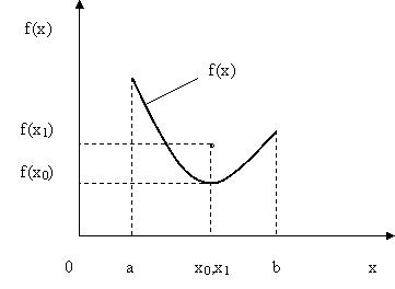 Трудности при использовании данного метода. Если целевая функция имеет узкую впадину, подобную приведенной на рис. 5.6, то можно ее проскочить, и вместо точки глобального минимума определить точку локального минимума. Т.е. вместо Метод золотого сечения. Рассматриваемая в данном методе функция должна быть унимодальной. Функция Суть метода золотого сечения заключается в том, чтобы определить точку глобального минимума на отрезке В соответствии с данным методом в каждый текущий момент времени рассматривается всегда две точки, например, в начальный момент точки Согласно свойству унимодальной функции в первом случае искомая точка xmin не может находиться на отрезке [ x 2, b ], во втором случае на отрезке [ a, x 1] (показаны штриховкой). Значит, область поиска сужается,