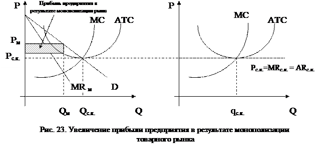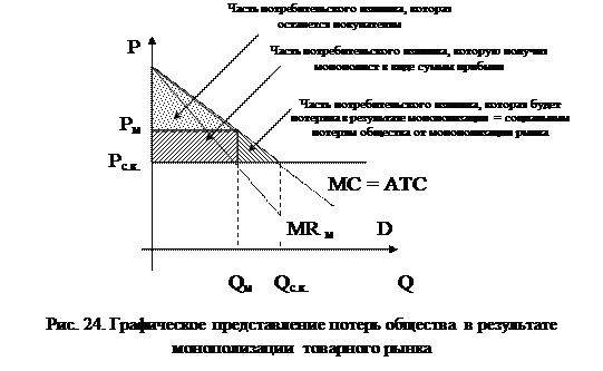 На рынке в условиях совершенной конкуренции в долгосрочном периоде каждое предприятие производит такой объем производства, при котором достигается минимальный уровень средних затрат. При этом ни одно из предприятий не в состоянии повлиять на ситуацию в отрасли, уровень цен формируется под воздействием отраслевого спроса и предложения. В результате на рынке установиться уровень цен, равный Рс.к., при объеме отраслевого производства Qс.к. = n*qс.к., где n – количество предприятий в отрасли, qс.к. – объем производства отдельного предприятия в условиях совершенной конкуренции. Если все предприятия договорятся между собой и заключат картельное соглашение, то кривая спроса отрасли совпадет с кривой спроса картеля, которой будет соответствовать кривая предельной выручки MR м. в результате объем производства уменьшится до Qм, а цена увеличится до Рм, при этом, если в условиях совершенной конкуренции все предприятия имели нулевую экономическую прибыль, то при создании картеля их прибыль также увеличится (см. рис. 23). В результате первоначальный потребительский излишек (см. рис. 18) перераспределиться, разделившись на три части (см. рис. 24): - часть потребительского излишка получат производители товара в виде суммы прибыли; - часть потребительского излишка останется в распоряжении покупателей; - часть потребительского излишка будет потеряна, что и является социальными потерями общества от монополизации рынка.