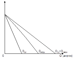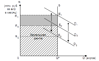 Рисунок 91. - Предложение земли Рисунок 92.- Совокупный спрос на землю Спрос на землю как фактор производства зависит от ее предложения и величины ренты, что изображено графически на рисунке выше (рис. 92). Рента имеет тенденцию колебаться вокруг равновесной точки Е (рис. 93) в зависимости от величины ренты R, R1, R2 и спроса на землю.