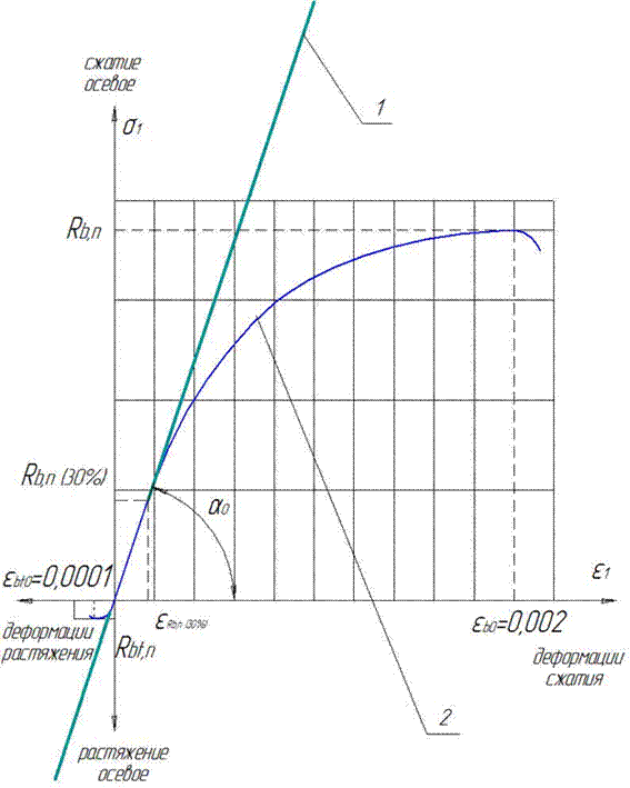 Рис. 2.2. График зависимости между деформациями и напряжениями бетона при сжатии и растяжении: 1 – прямая упругих деформаций (начальная стадия приложения нагрузки), 2 – кривая зависимости "s – e" (от начала приложения нагрузки до разрушения бетона)