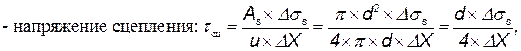 Экспериментальные исследования сцепления арматуры с бетоном производятся путем выдергивания арматурного стержня, заделанного в бетон. На рисунке 2.4 показано распределение напряжений выдергивания ss и сцепления tсц вдоль испытуемого образца – стержня арматуры. Для определения напряжения сцепления можно рассмотреть два близких сечения стержня на расстоянии DХ с переменным растягивающим усилием Z. Если обозначить диаметр стержня через u, а напряжение сцепления на единицу поверхности через tсц, то приращение растягивающего усилия по длине стержня определится по формуле: