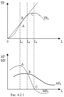 Аналогично определяется предельный продукт капитала MPK.Основываясь на законе убывающей производительности, проанализируем взаимосвязь общего (TPL), среднего (АPL) и предельного продуктов (MPL), (рис. 10.1). В движении кривой общего продукта (ТР) можно выделить три этапа. На 1 этапе она поднимается вверх ускоряющимися темпами, так как предельность продукта (MP) возрастает (каждый новый рабочий приносит больше продукции, чем предыдущий) и достигает максимума в точке А, т. е. скорость роста функции максимальна. После точки А (2 этап) в силу действия закона убывающей отдачи, кривая MP падает, т. е. каждый нанятый рабочий дает меньшее приращение общего продукта по сравнению с предшествующим, поэтому темп роста ТР после ТС замедляется. Но пока МР будет положительным, ТР будет все равно увеличиваться и достигнет максимума при МР=0.