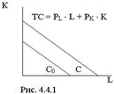 где ТС (total costs) – совокупные издержки, w - ставка заработной платы (другой вариант написания - PL), r - цена (процент) использования капитала (другой вариант написания - PK), L, K - количество труда и капитала. Информация об уровне издержек позволяет графически построить изокосту (линию равных затрат).