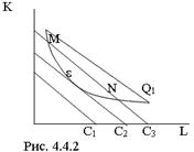 Рис. 10.1. Динамика и взаимосвязь общего, среднего и предельного продуктов На 3 этапе, когда количество рабочих становится избыточным по отношению к фиксированному капиталу (станки), МР приобретает отрицательное значение, поэтому ТР начинает снижаться. Конфигурация кривой среднего продукта АР также обусловлена динамикой кривой МР. На 1 этапе обе кривые растут, пока приращение объема выпуска от вновь нанятых рабочих будет большим, чем средняя производительность (АРL) ранее нанятых рабочих. Но после точки А (max MP), когда четвертый рабочий добавляет к совокупному продукту (ТР) меньше чем третий, МР уменьшается, поэтому средняя выработка четырех рабочих также сокращается. 18. Изокванта и изокоста, предельная норма технического замещения.Фирма может произвести одно и то же количество продукции, используя разные комбинации факторов производства, то есть разные способы производства по данной технологии. Технологический выбор фирмы означает выбор из множества способов производства одного в пределах данной технологии. Экономический выбор фирмы зависит от соотношения цен экономических ресурсов и влияет на технологический выбор. Для выявления основных экономических закономерностей обычно используют двухфакторную производственную функцию, которую можно представить как зависимость между объемом производства (Q) и затратами факторов производства (труда L, капитала К): Q = f (K, L). В графической форме производственная функция фирмы может быть представлена группой изоквант. Изокванта представляет собой кривую, которая показывает все сочетания производственных факторов, дающих определенный объем выпуска продукции. Таким образом, каждая изокванта отражает какой-то конкретный объем производства для данной технологии (например, объем выпуска – 1000 единиц продукции). И тогда производственная функция фирмы – это карта изоквант с различными уровнями объема производства. Q1; Q2; Q3 - карта изоквант.