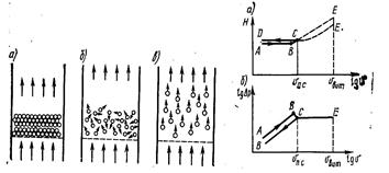 При движении жидкости через зернистые слои турбулентность в потоке развивается гораздо раньше, чем при течении по трубам, без резкого перехода от одного режима к другому. Практически ламинарный режим существует при Re £ 50. При Re > 7000 наблюдается автомодельная (по отношению к критерию Рейнольдса) область турбулентного течения. Тогда l = 2,34 = const. Потери давления в значительной степени зависят от порозности слоя, которая, в свою очередь, во многом зависит от способа загрузки слоя в аппарат и от соотношения диаметров зерна и аппарата. На практике при свободной засыпке слоя свободного объема e = 0,35…0,5. Плотность слоя, прилегающего к стенкам аппарата, меньше, чем в центре. Это связано с пристеночным эффектом. Чем больше соотношение диаметра аппарата и зерна (D/d), тем меньше пристеночный эффект и тем меньше неравномерность распределения скоростей потока в центре и в периферийной зоне аппарата. При движении жидкости снизу вверх через слой свободно насыпанного зернистого материала частицы твердой фазы испытывают лобовое сопротивление, которое зависит от изменения скорости потока. Это приводит к некоторому подвижному состоянию зерен. Различное подвижное состояние зернистого слоя широко применяется в процессах сушки порошковых материалов в кипящем слое, при транспортировании порошков, их смешении и т.п. При малых скоростях потока жидкости, проходящего через зернистый слой снизу, последний остается неподвижным, т.к. поток, проходя по межзерновым каналам, фильтруется через слой. При увеличении скорости потока промежутки между частицами увеличиваются – поток как бы приподнимает их. Частицы приходят в движение и перемешиваются с жидкостью. Образовавшуюся смесь называют взвешенным или псевдоожиженным слоем, т.к. масса твердых частиц в результате непрерывного перемешивания в восходящем потоке приходит в легкоподвижное состояние, подобное кипящей жидкости. Состояние и условия существования взвешенного слоя зависят от: · скорости восходящего потока; · физических свойств системы: плотности, вязкости, размера частиц и др. В зависимости от скорости движения жидкости существует три режима, которые характеризуют взаимодействие потока и отдельного зерна материала: 1) слой будет оставаться неподвижным в восходящем потоке, если скорость потока меньше скорости витания частиц (фильтрация); 2) слой будет находиться в состоянии равновесия (витания), если скорость потока равна скорости витания частиц (взвешенный слой); 3) твердые частицы будут двигаться в направлении потока, если скорость потока выше скорости витания частиц (унос). На рис. 6.3 представлены графики изменения высоты зернистого слоя и перепада давления в нем в зависимости от величины фиктивной скорости. Скорость, при которой нарушается неподвижность слоя, и он начинает переходить в псевдоожиженное состояние, называют скоростью псевдоожижения wпс.