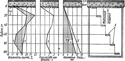 Рисунок 4.1 - Опит № 1 по вивченню фазового складу води, що мігрує, у полотні: 1 - початкова вологість: 2 - вологість після дослідження; 3 - конденсація пару в чашках; 4 - влагонакопичення за рахунок конденсації пару; 5 - загальне влагонакопичення; 6 - пароуловлючі чашки. По осі дороги вирубували одяг (асфальтобетон на грунтощебені, укріпленому бітумом) і в улаштовані в грунті ніша на глибинах 0, 20, 40, 60, 80 і 100 см закладали пароуловлюючі чашки за методикою А. Ф. Лебедєва (рис. 3.1) У чашки, заливали дистильовану воду і за даними періодичного їхнього зважування визначали кількість пару, що конденсується. У плані ніші зміщали по осі дороги, що дозволяло вимірювати конденсацію пару в кожному випадку, не порушуючи структури і структури грунту й одягу. Після установки чашки ніші закривали збоку щитками, шурф заповнювали ущільненим грунтом у порядку його початкової структури, а вирубування в одязі ремонтували і старанно заливали бітумом. У періоди зважування чашок із верха і споду ніші відбирали проби грунту на вологість. ММВ – максимальна молекулярна вологомісткість спроможність молекул грунту вміщувати і удержувати певну кількість води у % від абсолютноїсухої маси. МГ – властивість матеріалів поглинати (сорбіровати) вологу із повітря. Мають змочувані водою (гідрофільні) матеріали капілярно пористої структури, в тонких капілярах яких виходе конденсація вологи. З проведених опитів зроблені такі висновки: у теплий період року водяний пар дифундує від одягу униз; пар конденсується на стінках чашок, а основа залишається сухою; у холодний період року водяний пар дифундує від полотна нагору до одягу; вода з чашок випаровується, водяний пар конденсується на основі чашок; водяний пар у дорожній конструкції конденсується не в одній якийсь площині, а на всіх обріях активної зони (див. рис. 3, крива 3); у всіх досвідах найбільша конденсація відзначалася на глибинах 20-40 см для грунту полотна і на глибинах 50-60 см для грунту відкритого поля; ця критична глибина з максимальною конденсацією водяного пари відповідає глибині загасання добових температур; питома вага водяного пари в загальному потоку мигрируючої води складає біля ¾, досвідами також установлено, що при промерзанні грунту з початковою вологістю не вище 0,60 притока води в зону промерзання відбувається тільки в пароподібній формі; характер зміни вологості дорожньої конструкції по глибині визначається закономірностями дифузії і конденсації водяного пари; у всіх досвідах криві кінцевої вологості грунту і конденсації пару мали аналогічний вид (див. рис. 3, криві 2 і 3); оскільки в загальному потоці води, що мігрує, основну частину складає водяний пар, то для підвищення стійкості земляного полотна і дорожніх одягів необхідно проектувати заходи, що обмежують доступ води. у верхню частину полотнини в пароподібній формі.