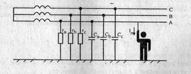При аварійному режимі роботи мережі за умови замикання однієї з фаз на землю (рис. 8) струм, котрий проходить через людину, доторкнувшись до справної фази, виразиться залежністю: