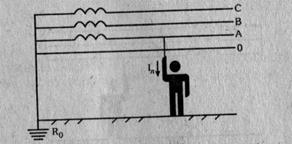 Таким чином, при дотику до одного з фазових проводів мережі з ізольованою нейтраллю в нормальному режимі струм через людину залежить від опору втрати та ємності мережі відносно землі. Замикання однієї з фаз на землю значно підвищує небезпеку однофазового дотику, оскільки в цьому випадку людина опиняється під напругою, близькою до лінійної. Найнебезпечнішим є двофазовий дотик. Небезпека трифазових електричних мереж з глухозаземленою нейтраллю. Трифазові електричні мережі з глухозаземленою нейтраллю мають малий опір між нейтраллю та землею. Напруга будь-якої фази справної мережі відносно землі дорівнює фазовій напрузі. Струм через людину при однофазовому дотику (рис. 9) визначається за виразом: